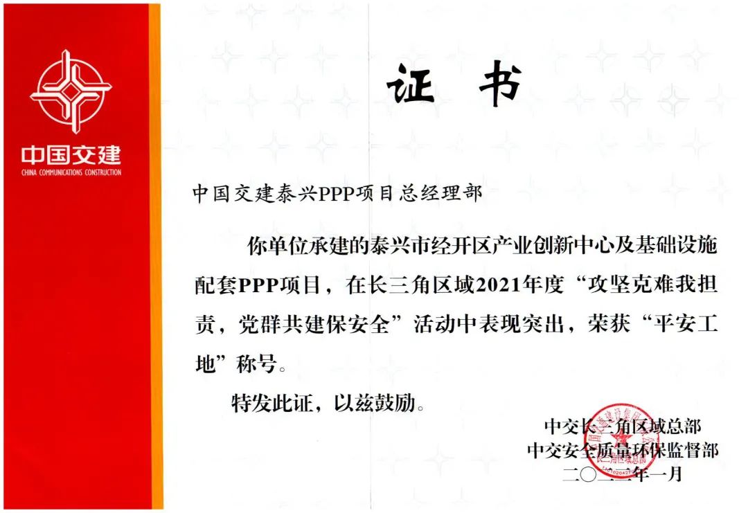 近日,在中国交建长三角区域总部“攻坚克难我担责,党群共建保安全”活动中,泰兴PPP项目荣获“平安工地”荣誉称号。