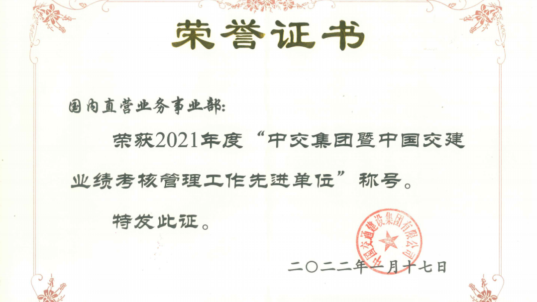 放榜了!中交国内部(总承包分公司)荣获中交集团七类九项荣誉 17/01/2022